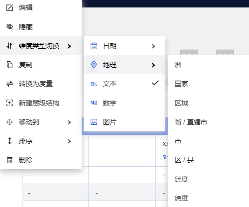 1.当前公有云标准版的Quick BI只支持空间类的色彩地图和气泡地图,这两个图表维度只支持配置地理区域。以色彩地图为例,确保您已有的数据集中已存在与地理区域信息相关的字段(例如省、市、区),并且类型已经转化为地理,如下图: