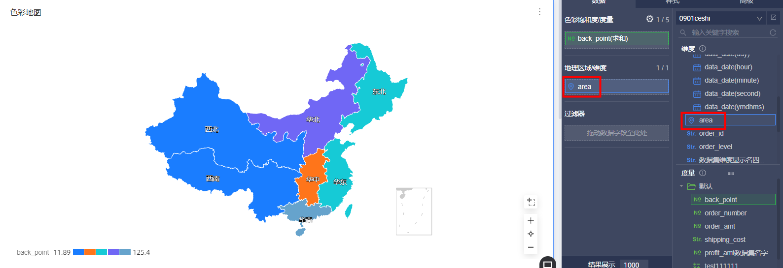 2.在色彩地图中配置地理字段和相关度量,更新图表即可看到效果: