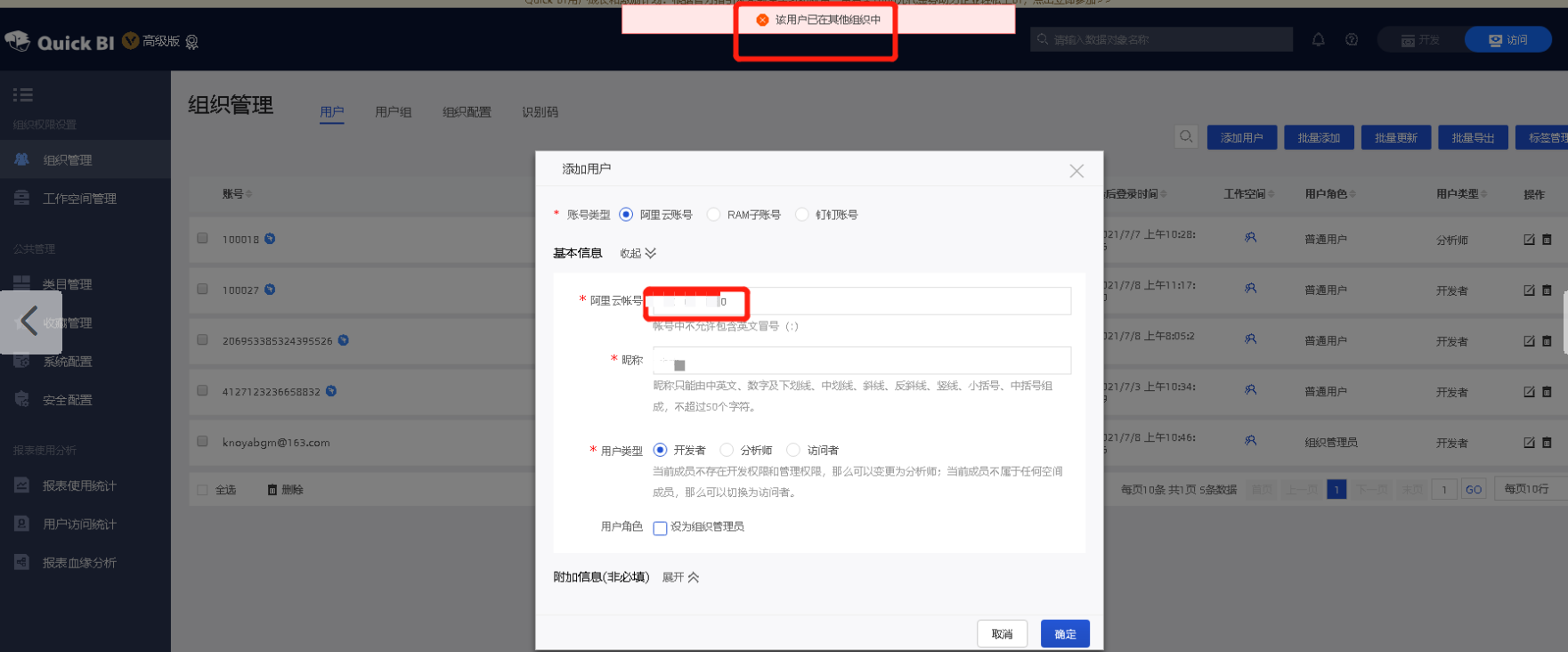 Quick BI添加组织成员时报“该用户已经在其他组织中”错误