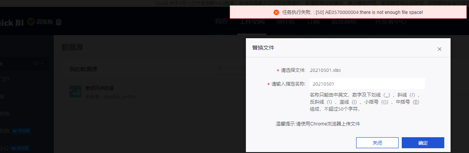 在群空间中,MySQL数据源上传文件,提示“任务执行失败:there is not enough file space”