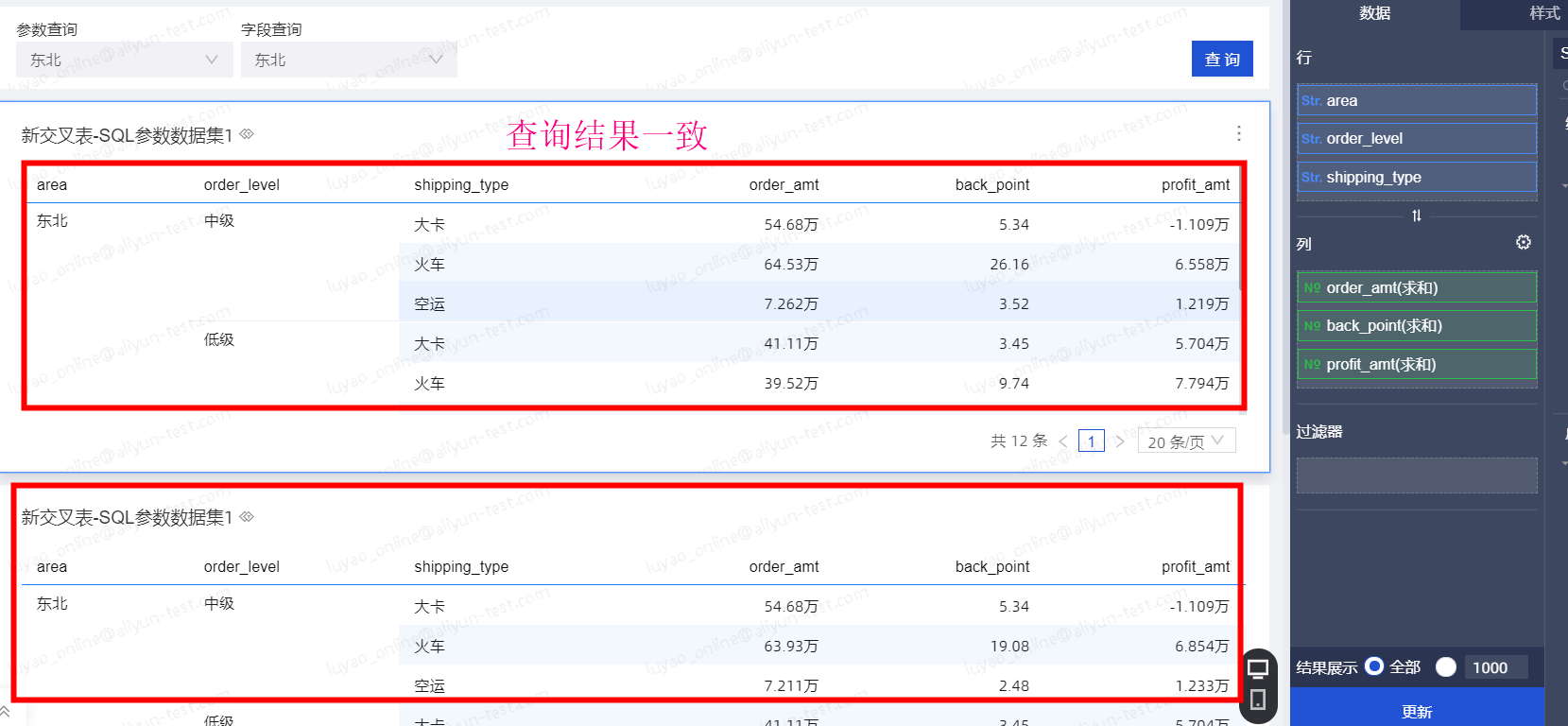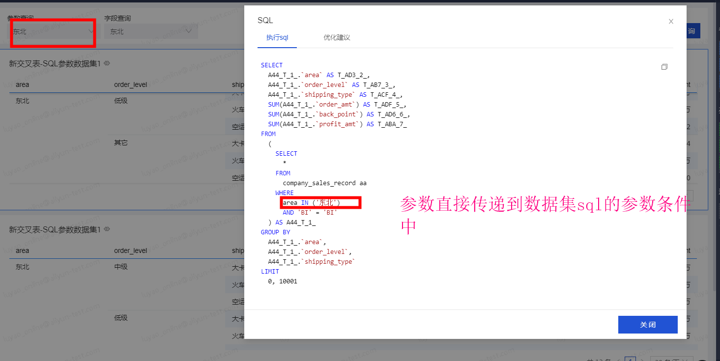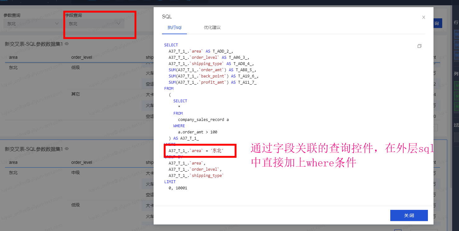 2.查询控件是通过字段和图表关联时,实际是在外层图表图查询的外层sql中加上where条件,从而进行数据过滤;而通过参数关联图表的查询控件是直接把条件传递到数据集的sql语句中,在数据集层查询数据时就对数据做了“筛选”,外层图表查询的sql语句查询的数据量就会比较小。具体对比如下: