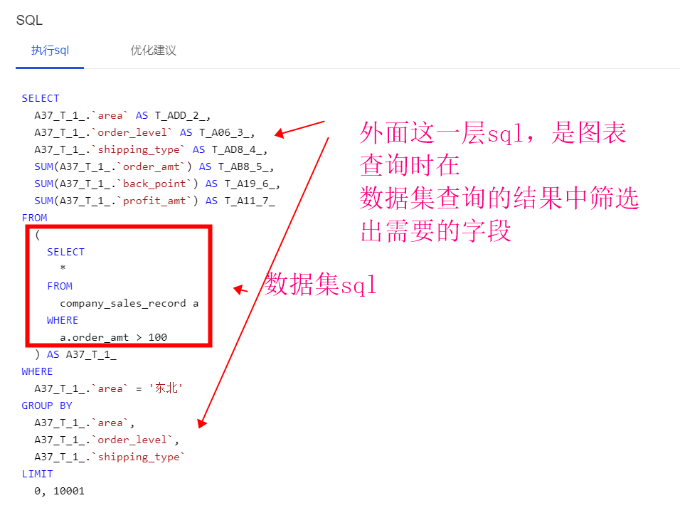 1.首先要清楚数据集本质上是对数据库数据查询的SQL语句。图表展示加载数据时,实际是在数据集的SQL语句外面加了一层查询,基于数据集的查询结果再次进行的一层业务上需要的字段的筛选和过滤。