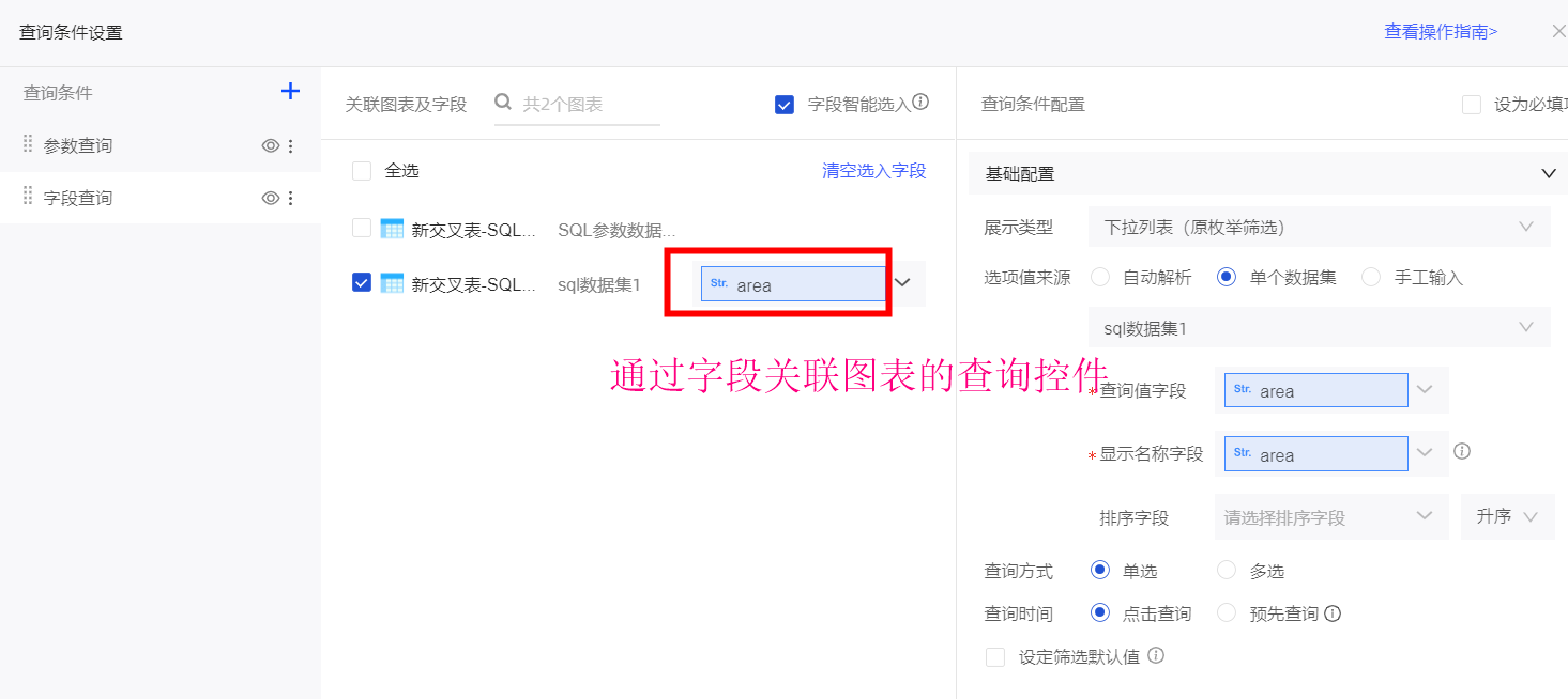 Quick BI查询控件中与图表关联选择字段和选择sql自定义参数的区别