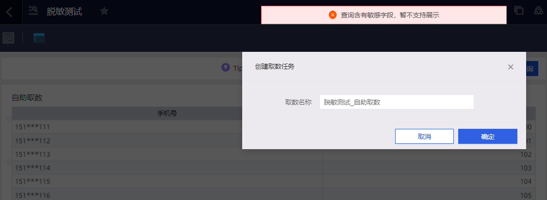 1.当您在自助取数的任务界面配置了脱敏字段后,如果要创建自助取数任务,页面会提示“查询含有敏感字段,暂不支持展示”(产品目前不支持自助取数下载脱敏后的数据),如下图: