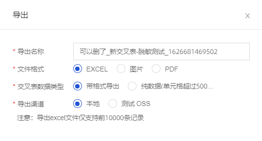 2.如您需要下载脱敏后的数据,建议您使用交叉表的导出功能。在交叉表中配置好行列信息,点击图表右上角三个点,选择“导出”。选择您期望的文件格式和数据类型,点击“确定”。