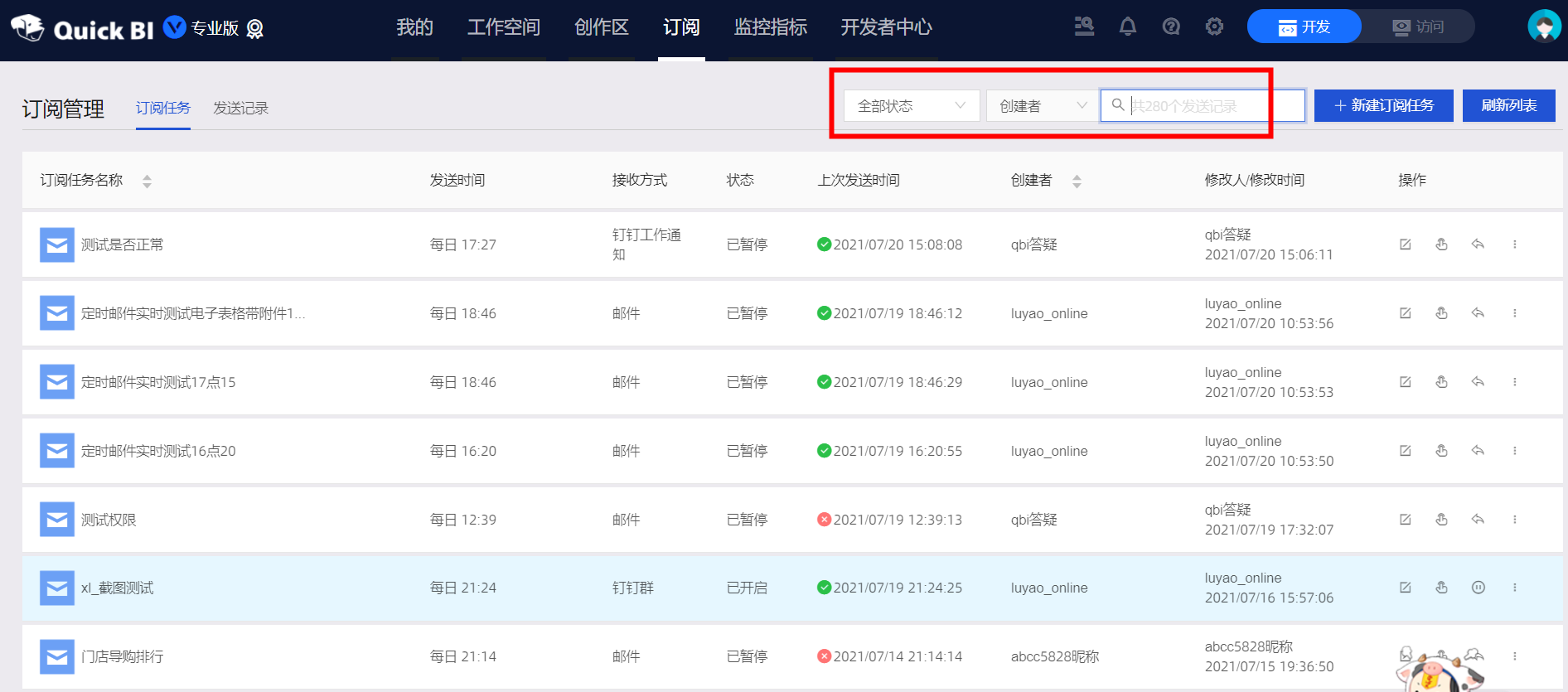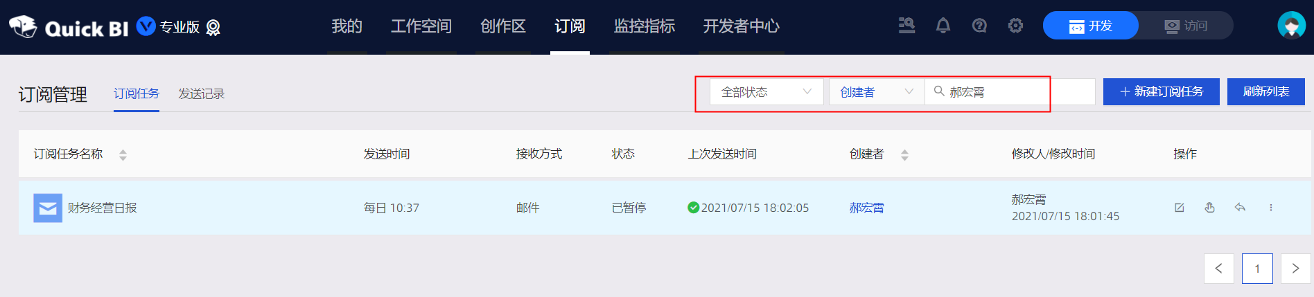 查看订阅任务,右上角筛选默认选择创建人为当前登录用户。