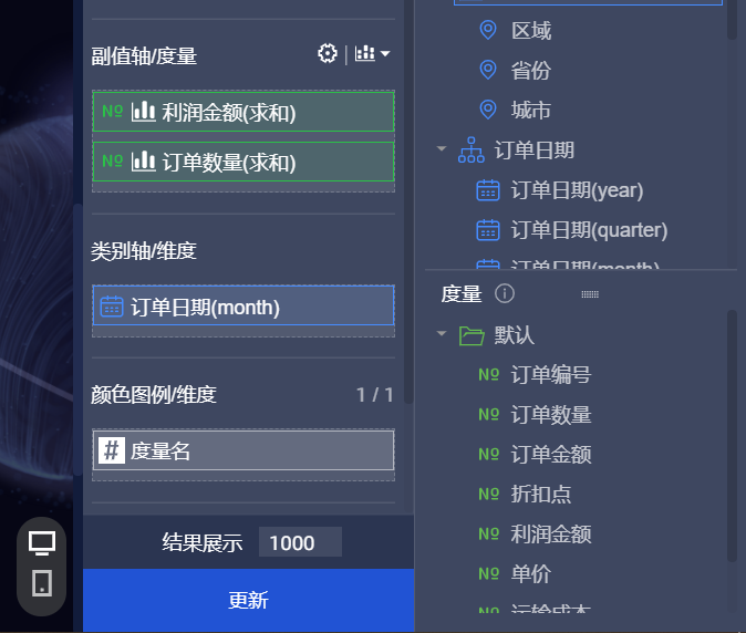 选择需要展示的度量,以及维度,通过切换样式,实现多样展示数据,如下所示: