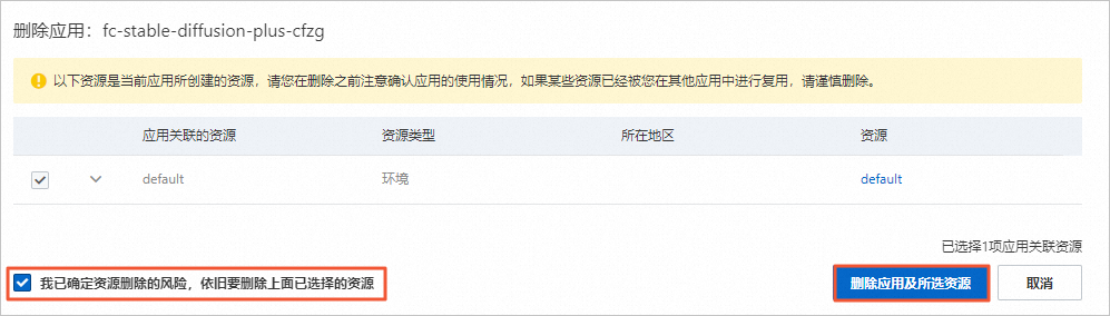 在删除应用对话框中,选中我已确定资源删除的风险,依旧要删除上面已选择的资源,然后单击删除应用及所选资源。