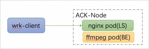 在本实验中,我们会在ACK Pro版集群中运行在线应用nginx和离线应用ffmpeg的混部测试。其中,一台节点会运行nginx Pod,作为nginx server端,并在同一节点上运行ffmpeg,形成在离线混部的环境;另一台同网段节点作为client端运行wrk,向nginx发送请求。