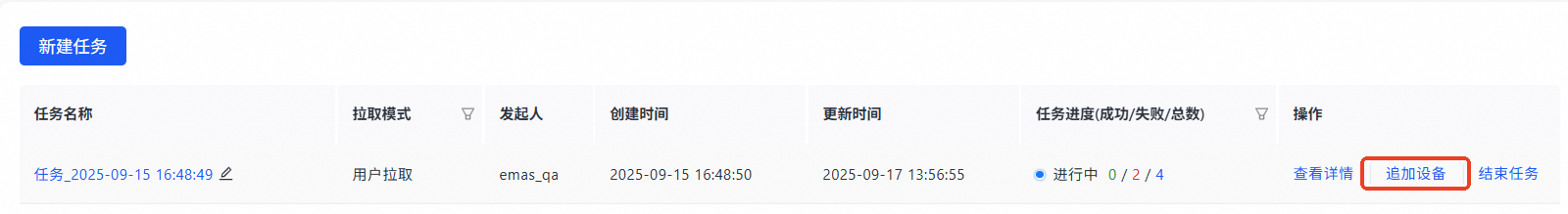 用户拉取场景:根据设备ID/名称指定追加的拉取设备。具体操作请参见新建任务。
