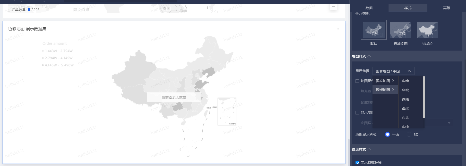 色彩地图组件添加后,默认展示的是全国地图,您可以在样式中修改显示范围: