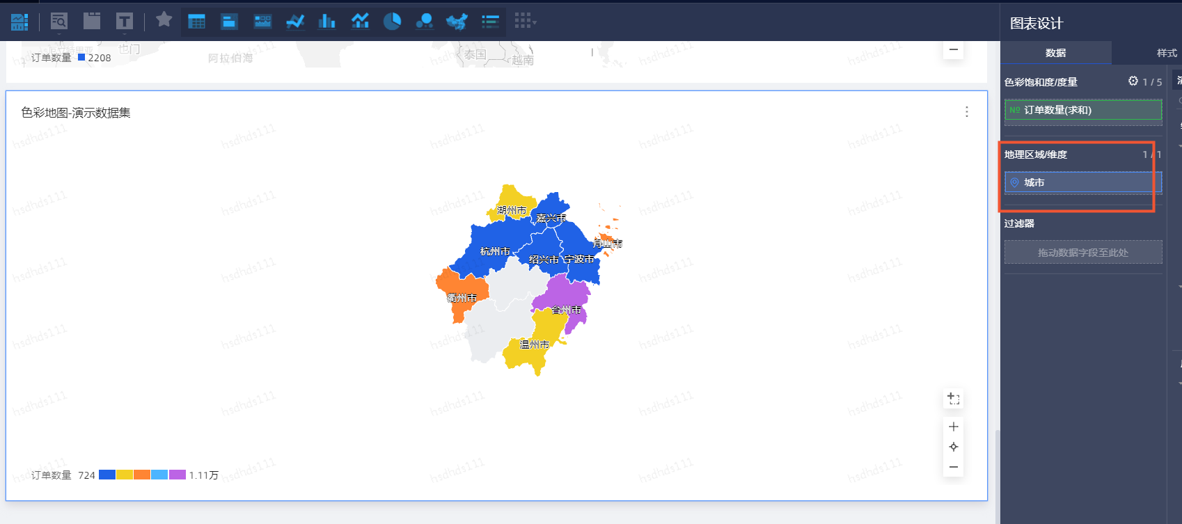 - 如果您想展示某个区域的地图,需要在图表的数据编辑区,地理区域/维度中添加省/直辖市类型的字段