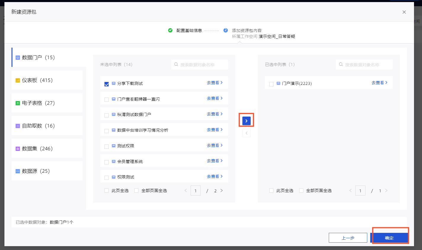 3、作品间会自动检测依赖关系。比如选中了某个数据门户,那么挂载到该数据门户的所有仪表板、电子表格都会被同时选中,创建该仪表板、电子表格所用的数据集也会被选中,数据集所引用的数据源也会被选中。如果您的所有仪表板、电子表格都挂到了数据门户上面,那么导出资源包时,只需要导出数据门户即可,不需要再去选择仪表板、数据集。