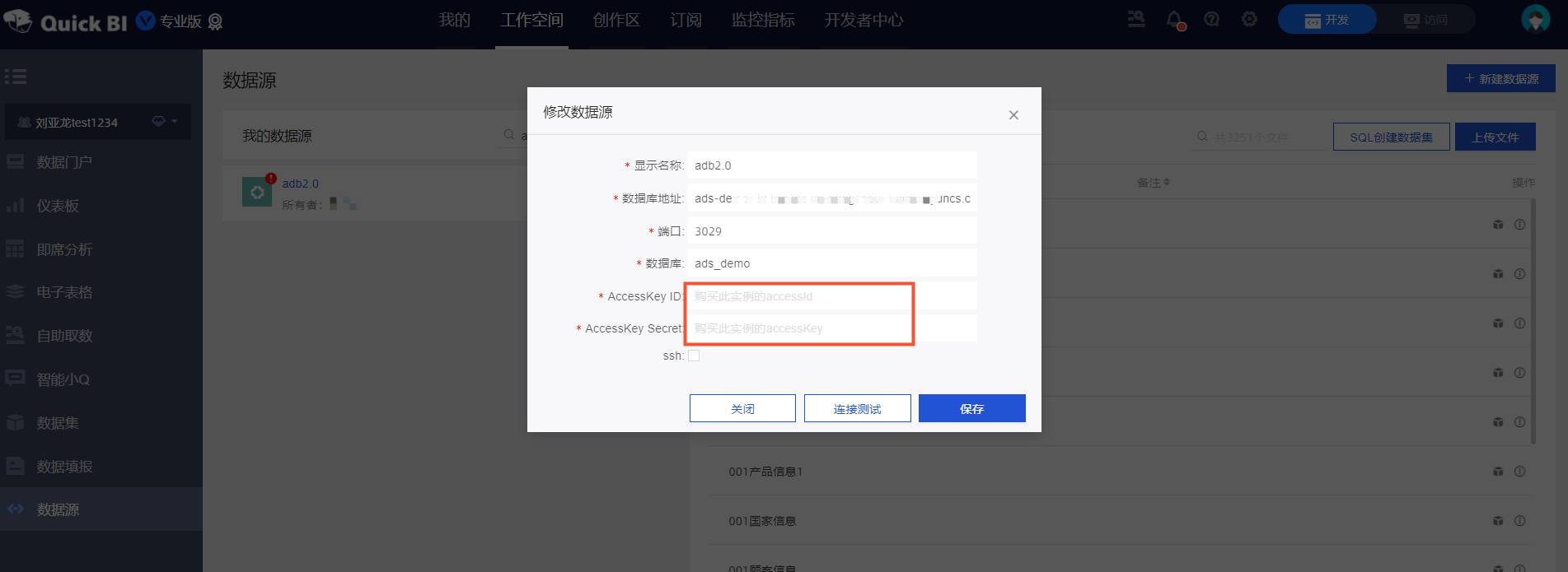 - 资源包导入到新的工作空间后,需要进入工作空间->数据源列表页,重新配置数据库账号信息。