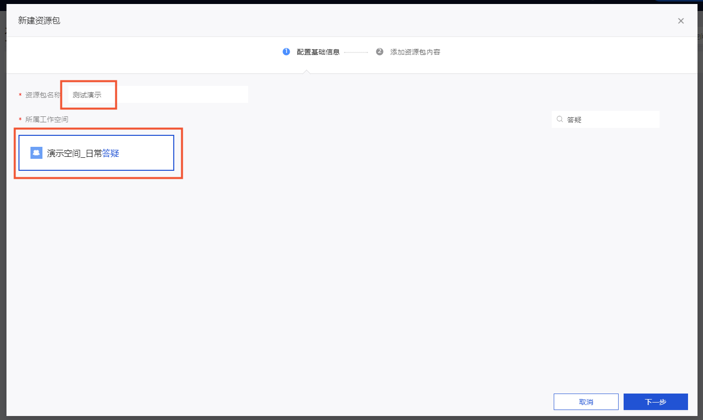 - 在弹出页中自定义资源包名称,选择作品所在的群空间,单击下一步