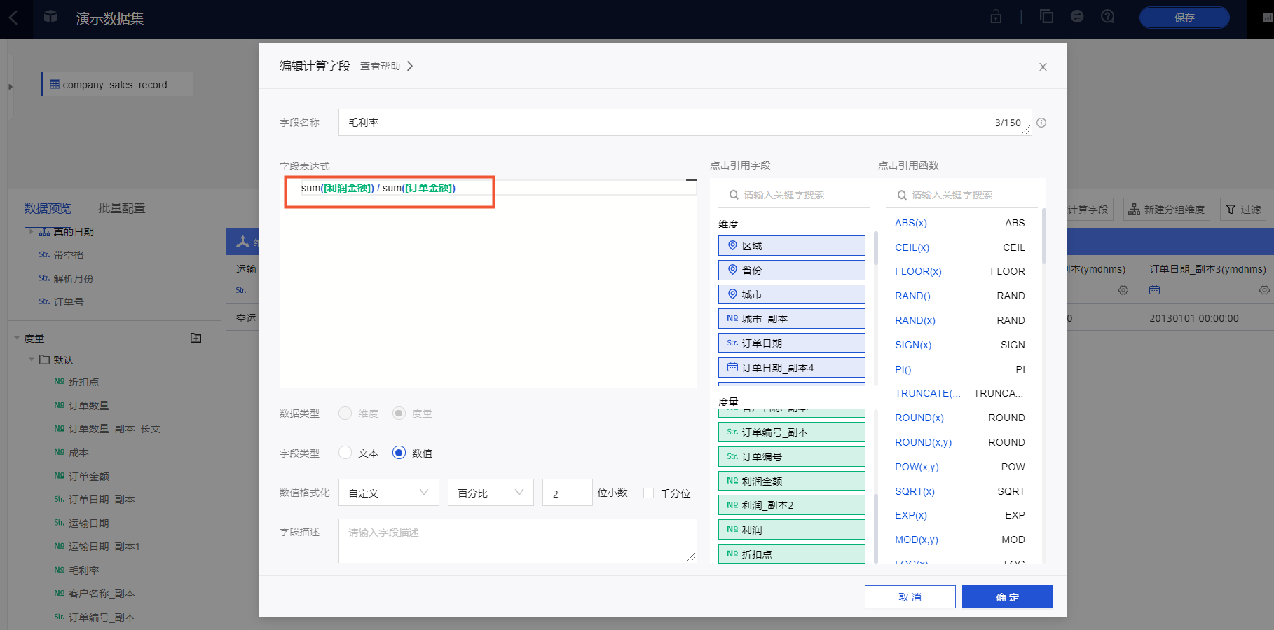已经添加了一个计算字段(毛利率字段),另一个计算字段需要用到该计算字段,但是无法选择到这个字段