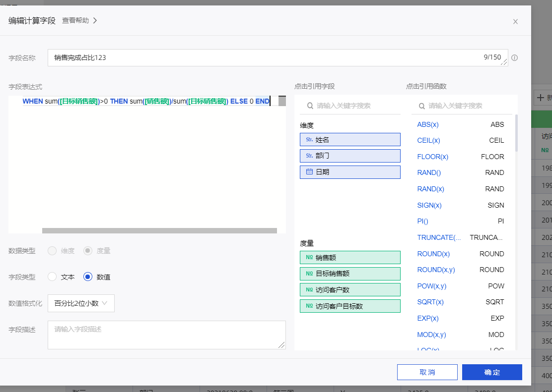 CASE WHEN [目标销售额]>0 THEN [销售额]/[目标销售额] ELSE 0 END。