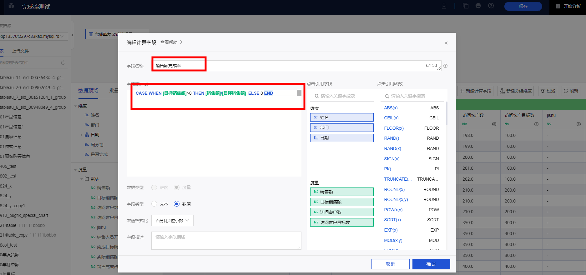 客户业务场景如下:需要计算每个销售每天目标销售额的完成率,同时需要计算所有销售总的目标销售额完成率。客户添加计算字段销售目标完成率,其表达式为: