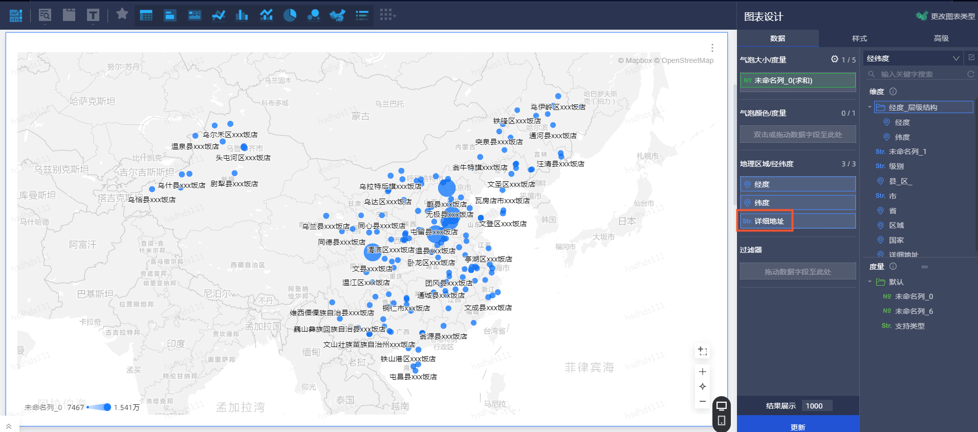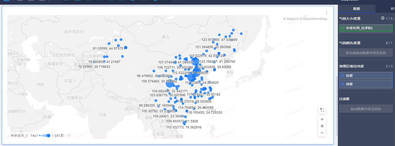 然后在lbs地图中,您只要将该字段和经纬度字段一起加到地理区域/经纬度中即可,效果如下: