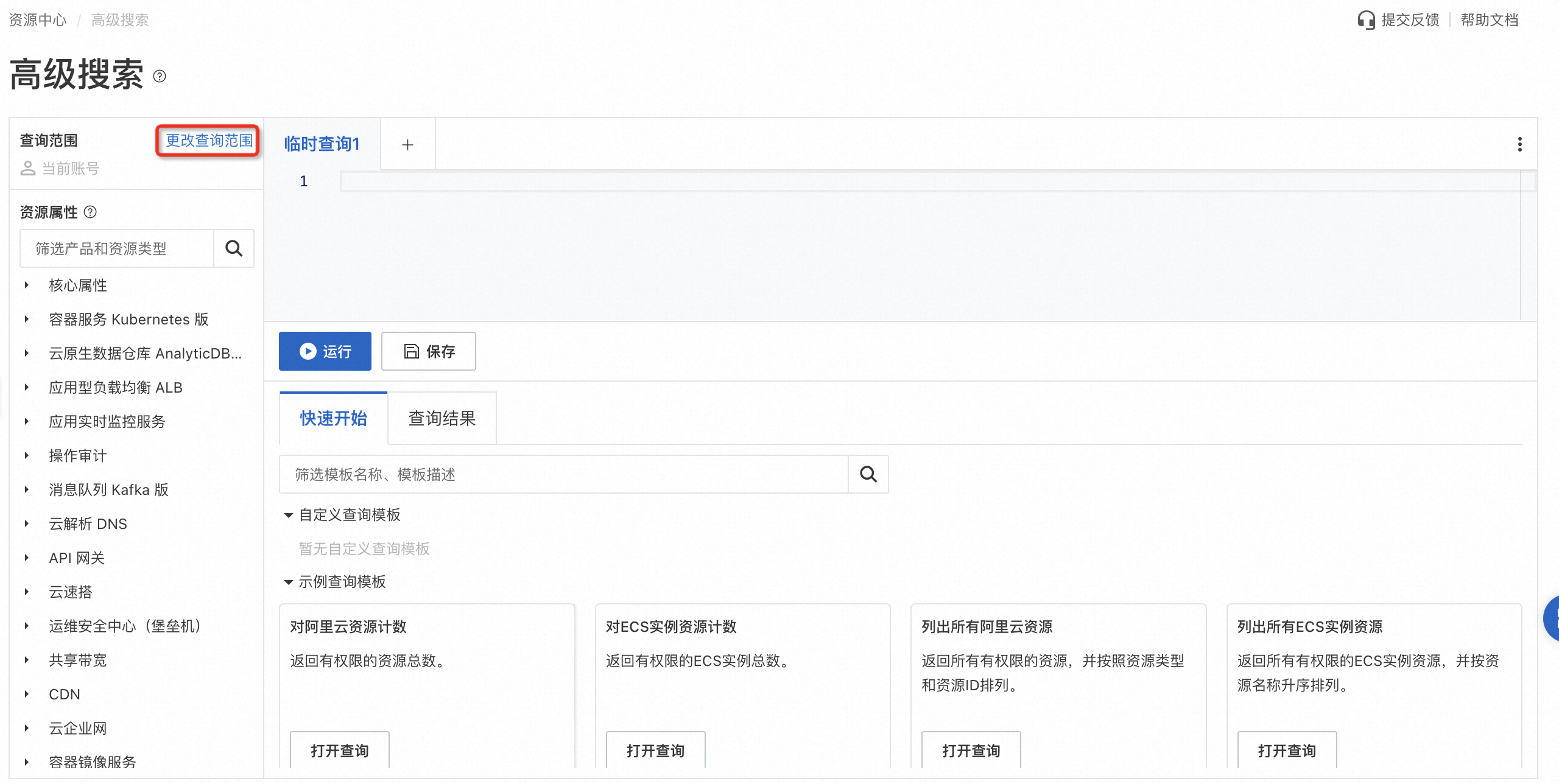 在左侧导航栏选择 资源中心 > 高级搜索。更改查询范围为跨账号。选择您需要查询的成员账号、资源夹或者整个资源目录。这里以 Applications 资源夹为例。