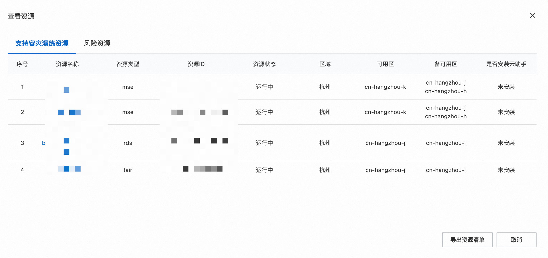 点击查看资源,可以查看当前应用中支持容灾演练资源的资源信息及不支持高可用的风险资源。