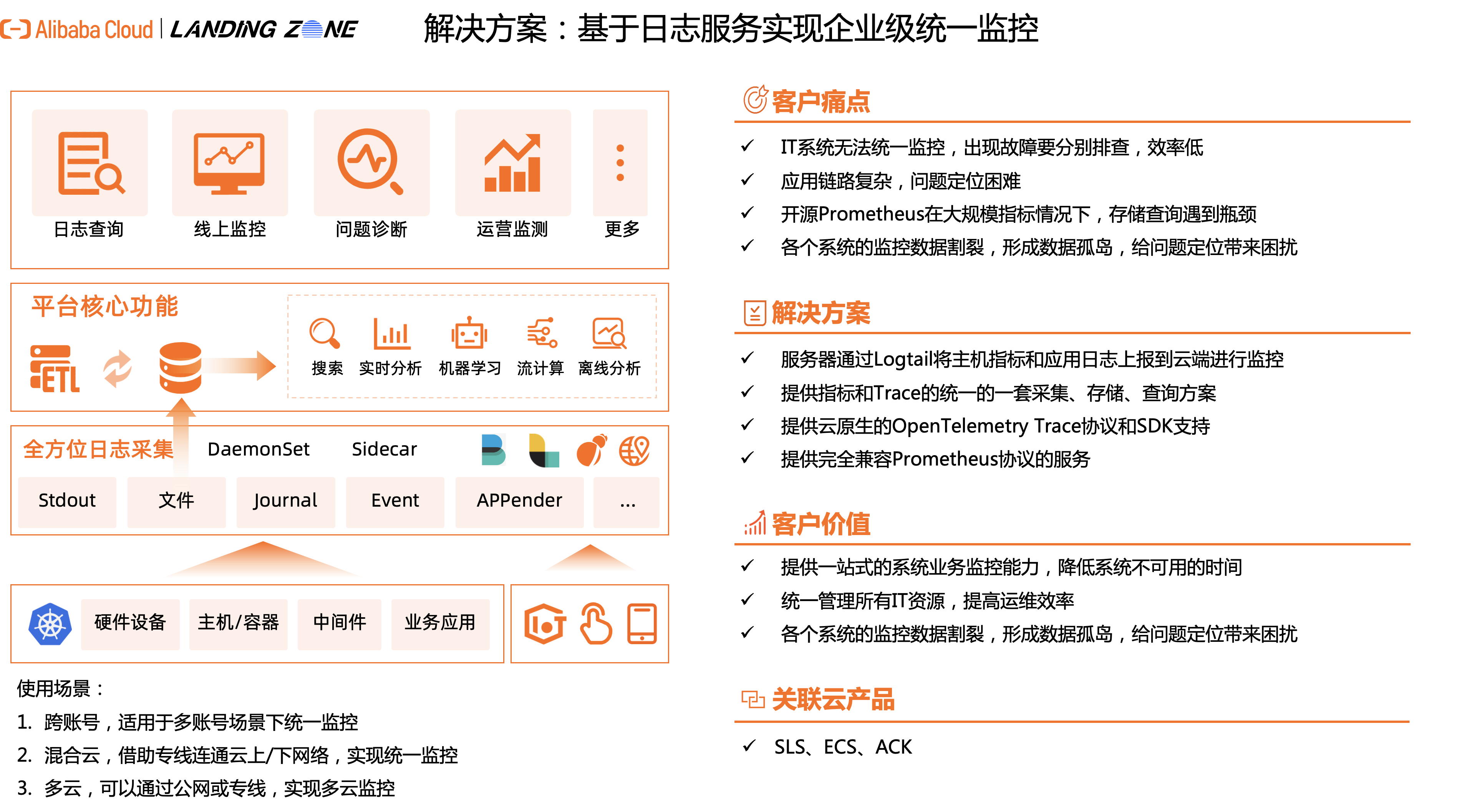 随着企业信息化的发展,面向云的IT基础设施越来越普遍,如何解决超大软件系统监控问题,成为IT稳定性保障的关键环节。 本方案主要介绍如何使用SLS 对阿里云、企业自有IDC以及第三方云场景下,进行企业级的监控方案。