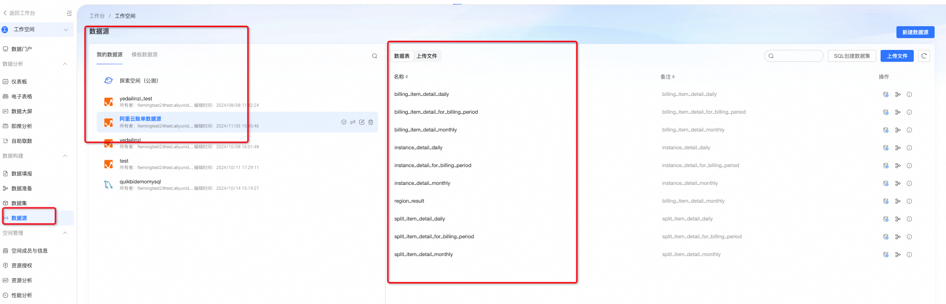 替换数据集,要选择自己的数据集进行替换,要先建立自己的数据集,阿里云的账单模版主要用到了两个数据,我们将基于这俩数据做数据集: