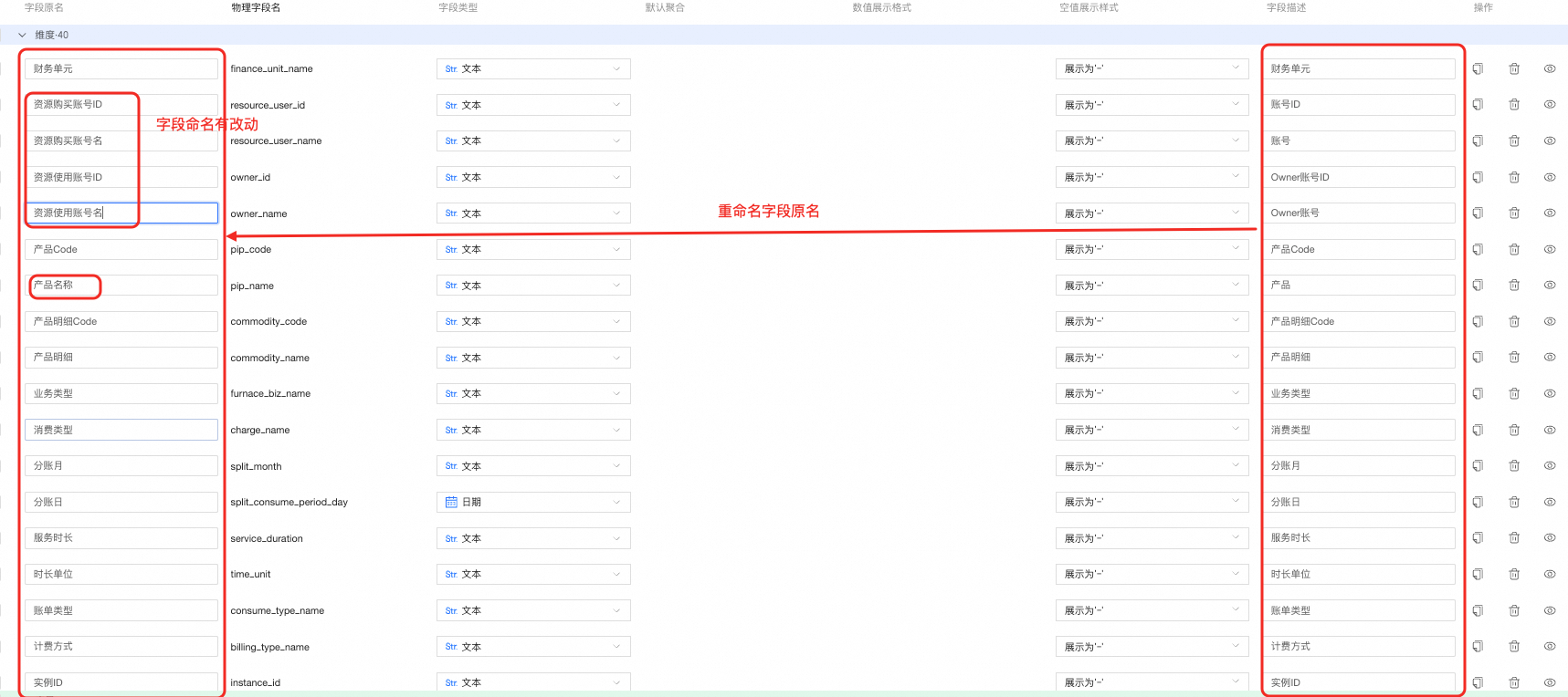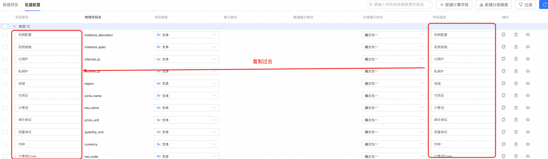 打开 批量配置,先对所有字段重新命名为中文,把描述字段的中文copy到字段原名字段: