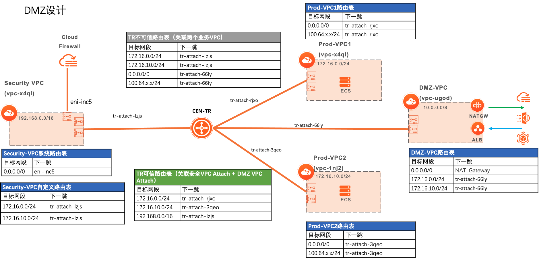 VPC间已通过CEN-TR完成组网,DMZ VPC与VPC1、VPC2可互通。CEN-TR组网可参考帮助文档使用云企业网实现跨地域跨账号VPC互通(企业版)。
