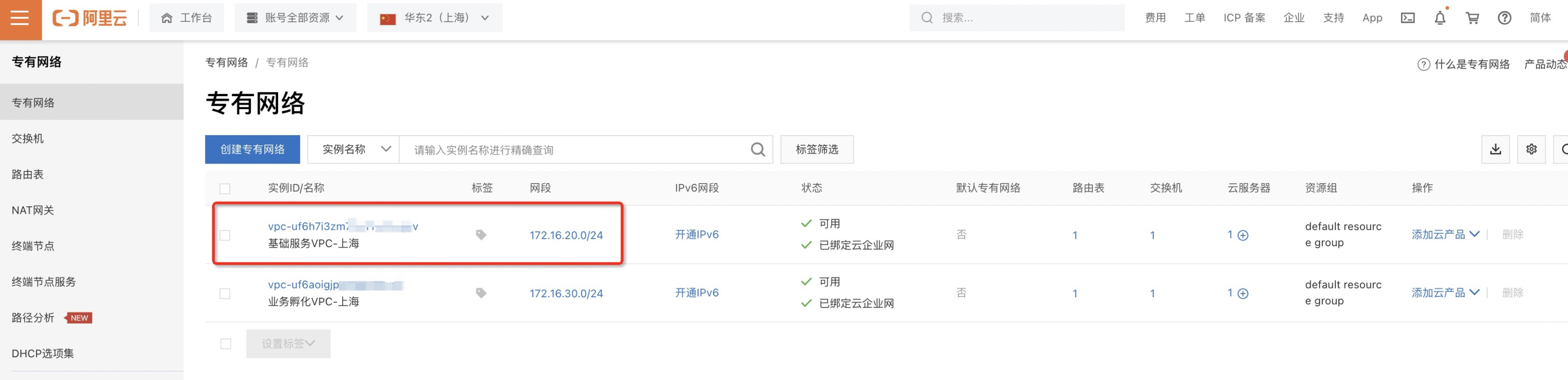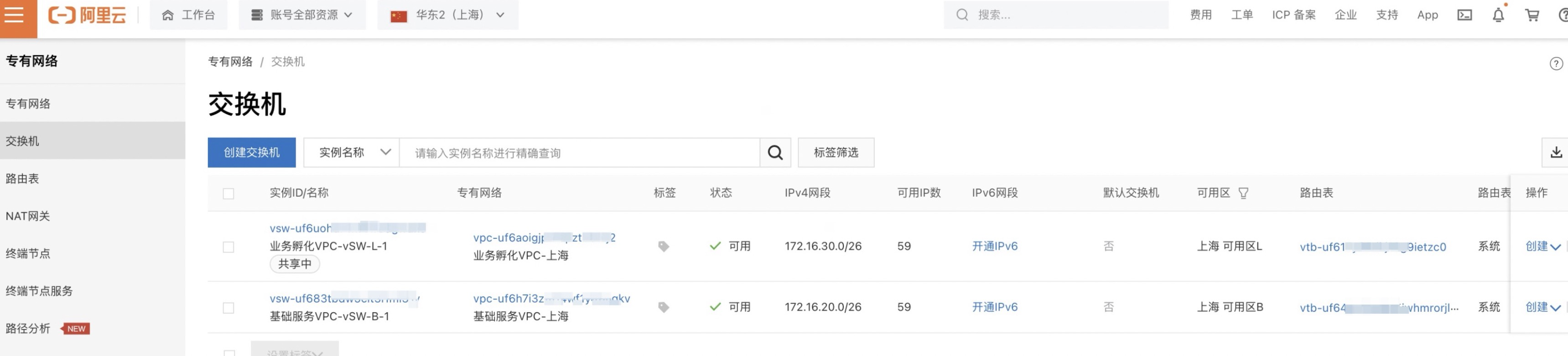 分别在基础服务VPC内创建一个交换机,并各自新增一台ECS,供测试连通性使用。