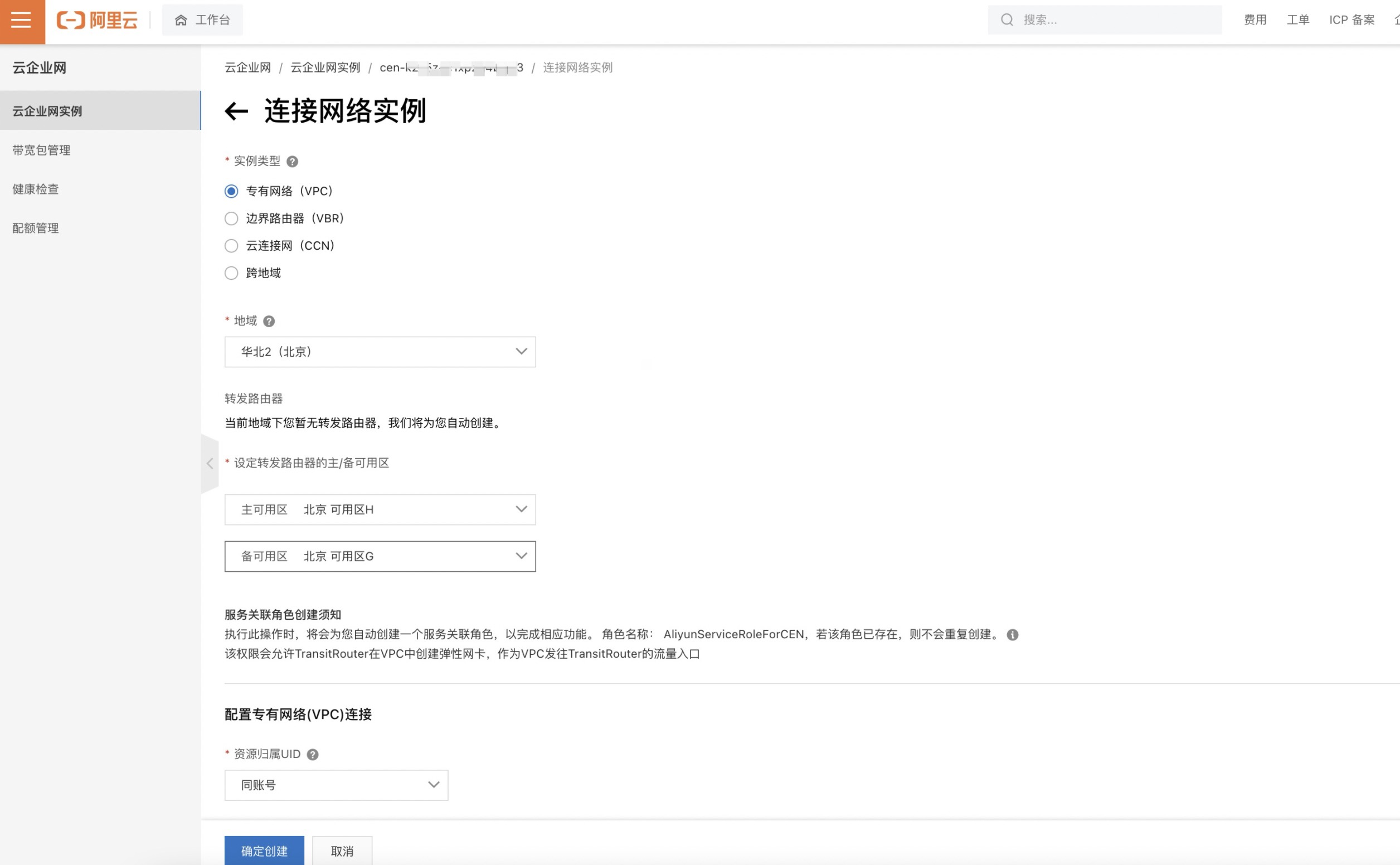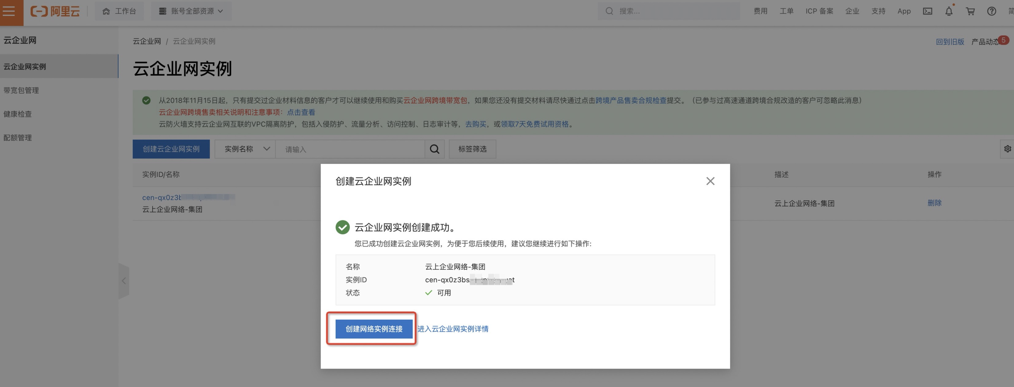 登录账号1,进入对应CEN,选择相应的转发路由器创建网络实例连接。