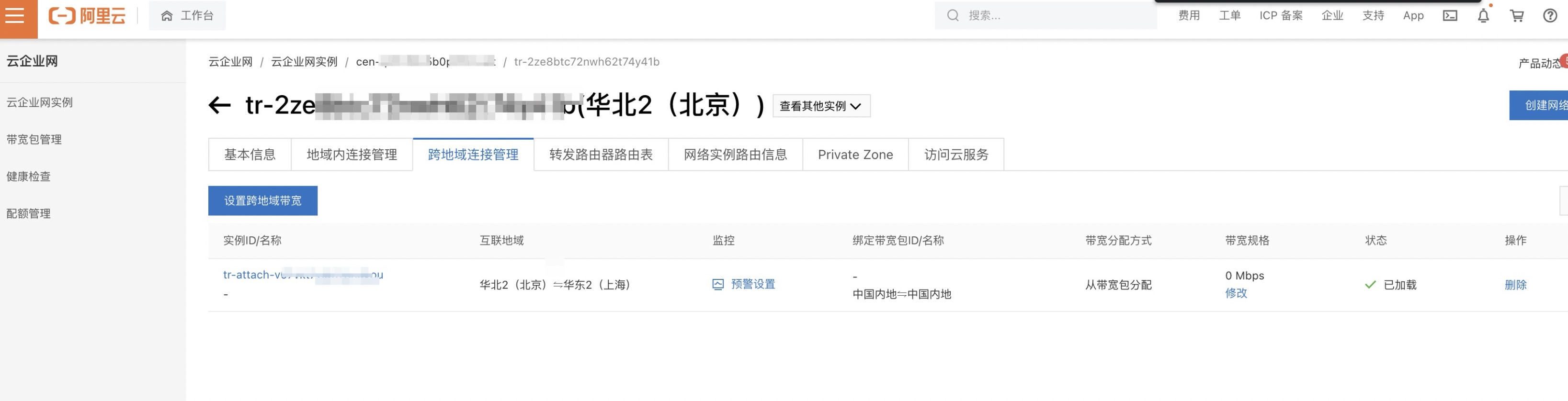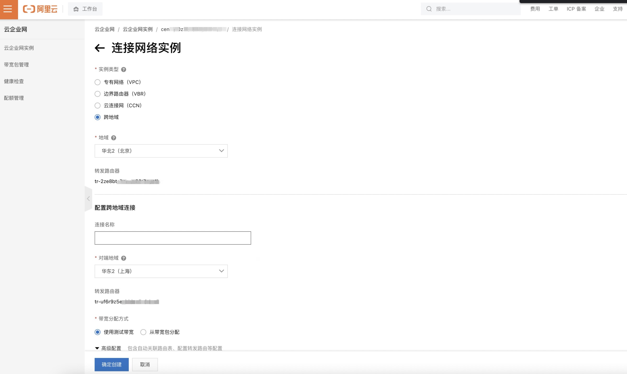 构建上海和北京的网络互通需设置跨地域连接,这里设置北京-上海的跨地域连接,这里使用测试带宽。实际跨地域连通需要使用带宽包。