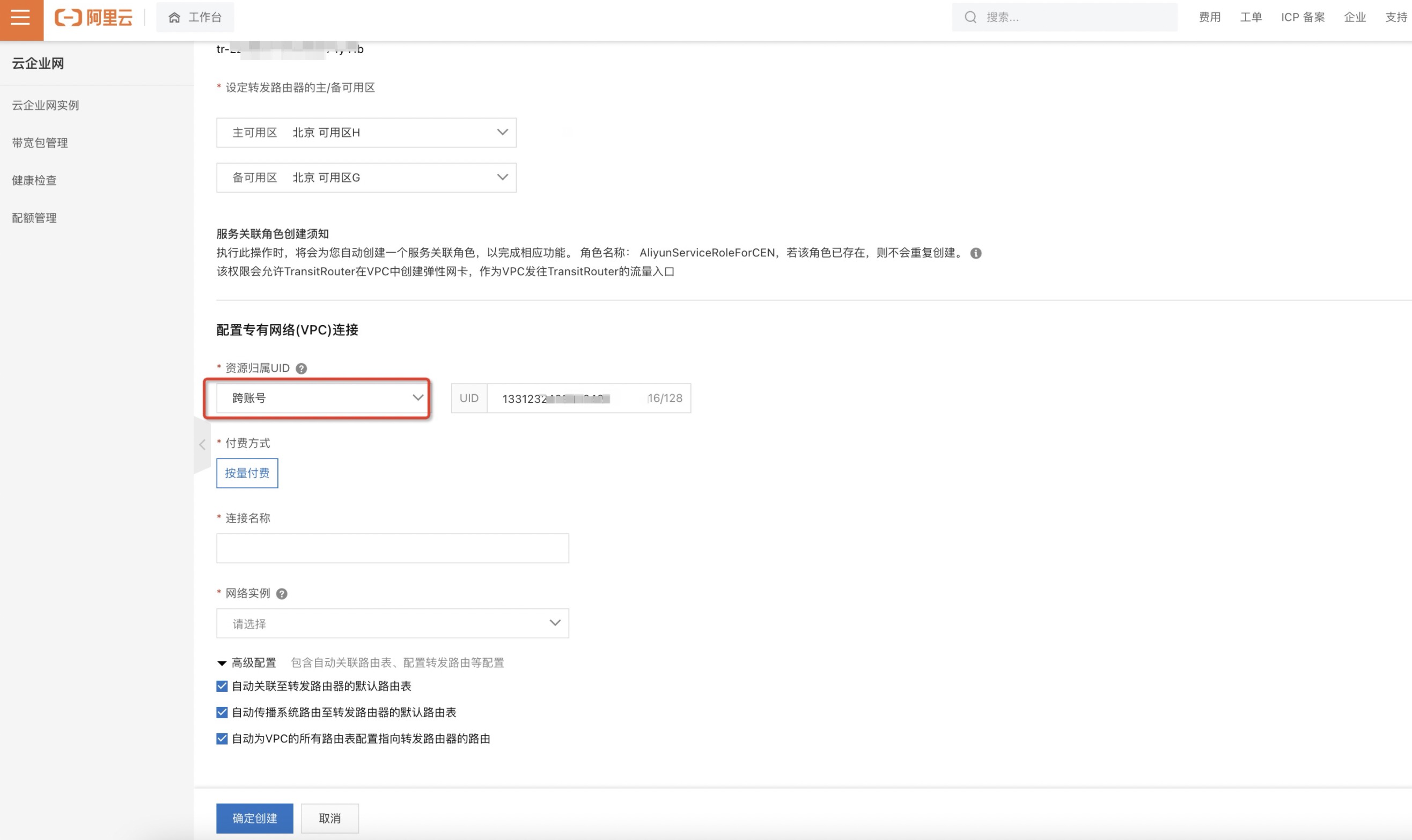 选择跨账号,填入账号2的UID,将已授权过的数据互通VPC加入CEN。