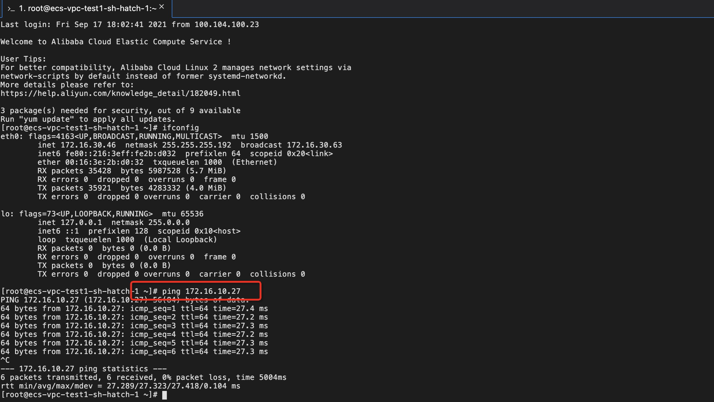 分别在上海VPC和北京VPC的ECS上相互ping内网地址,查看内网通信是否正常。