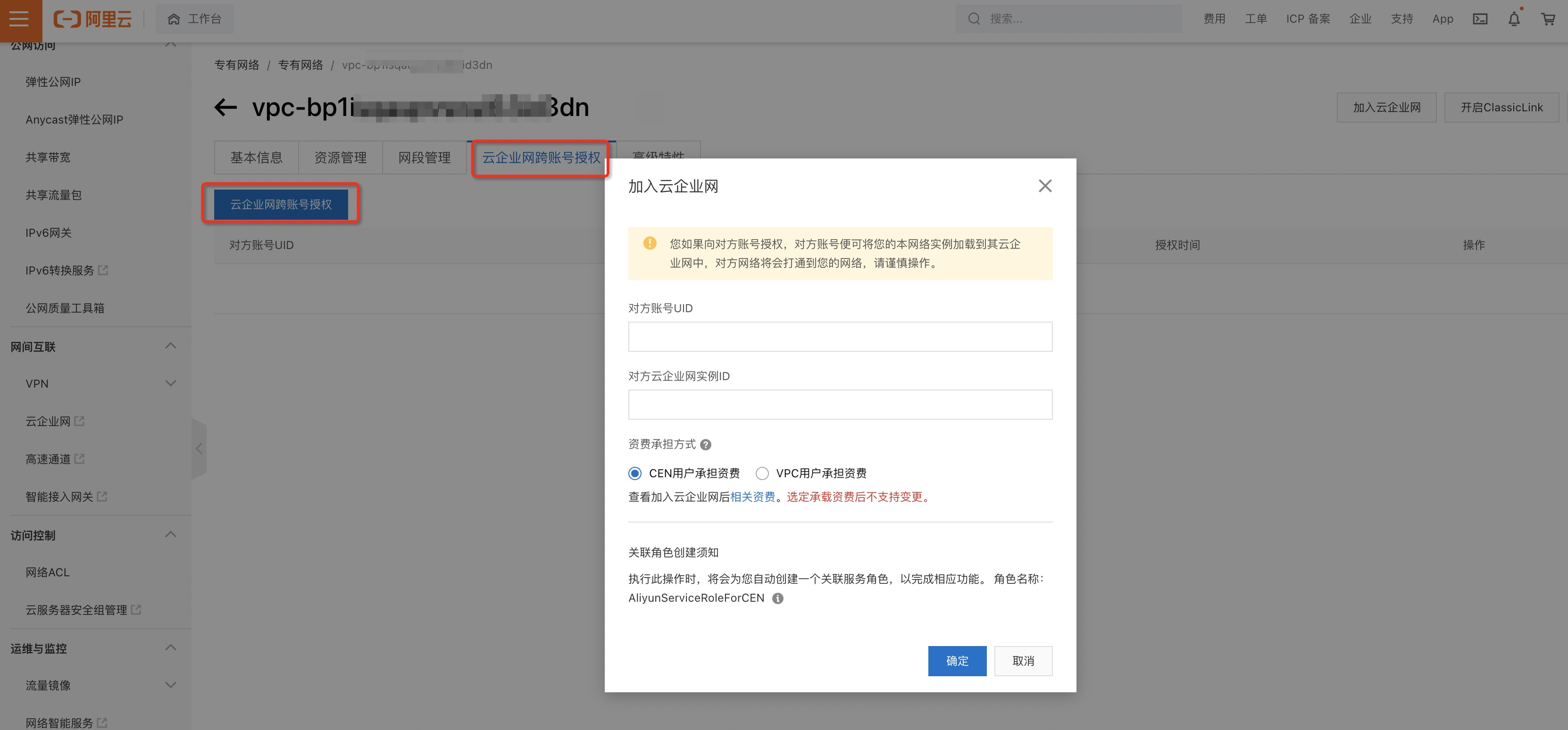 在账号2的VPC详情页面填入账号1的UID及云企业网实例ID,将数据互通VPC跨账号授权给账号1。