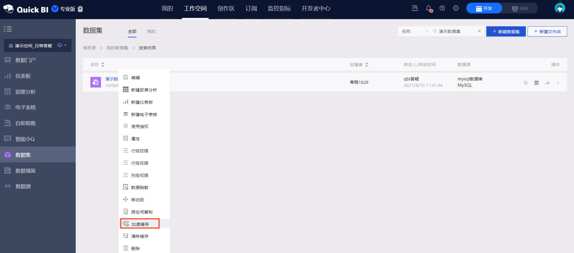 - 进入数据集列表页,右键需要加速的数据集,点击加速缓存