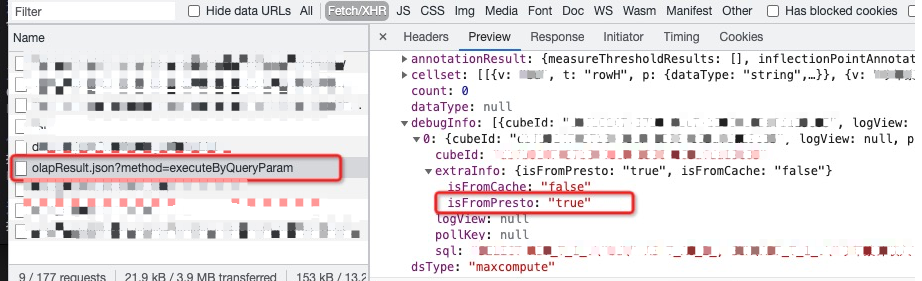 3.请确认MaxCompute数据集是否开启了Presto加速。如果开启了,查询会同时走Presto和MaxCompute,哪个返回快就获取哪个数据。对于自定义SQL,Presto会有一天缓存,所以修改了之后缓存没刷新也就不生效,您可以通过如下方式判断是否开启了Presto加速。如果是这种场景,建议新建一个数据集,或者等第二天再查看报表。