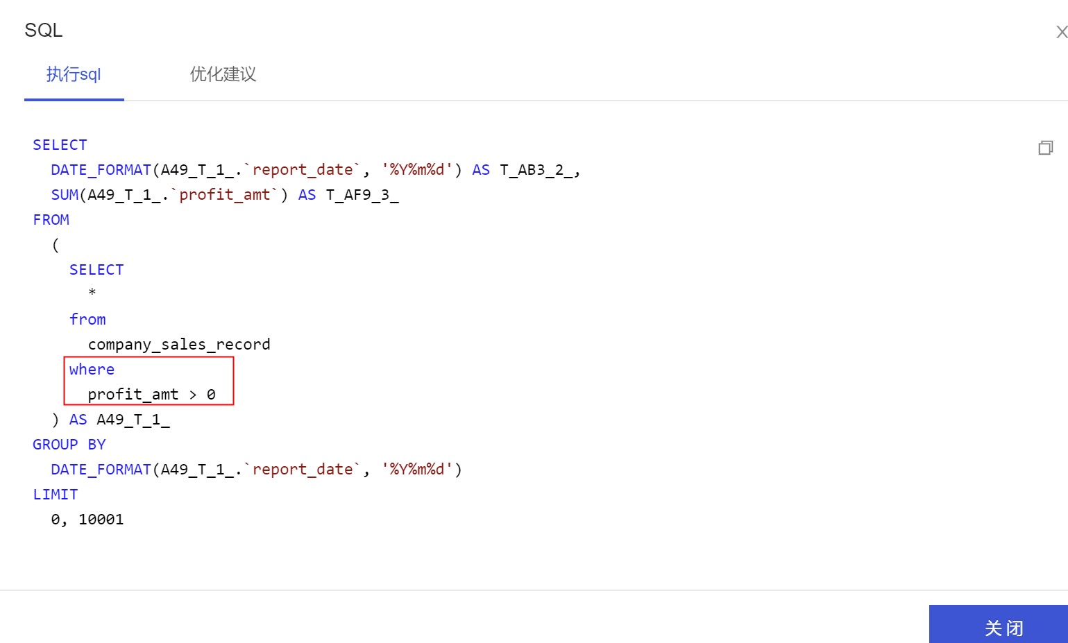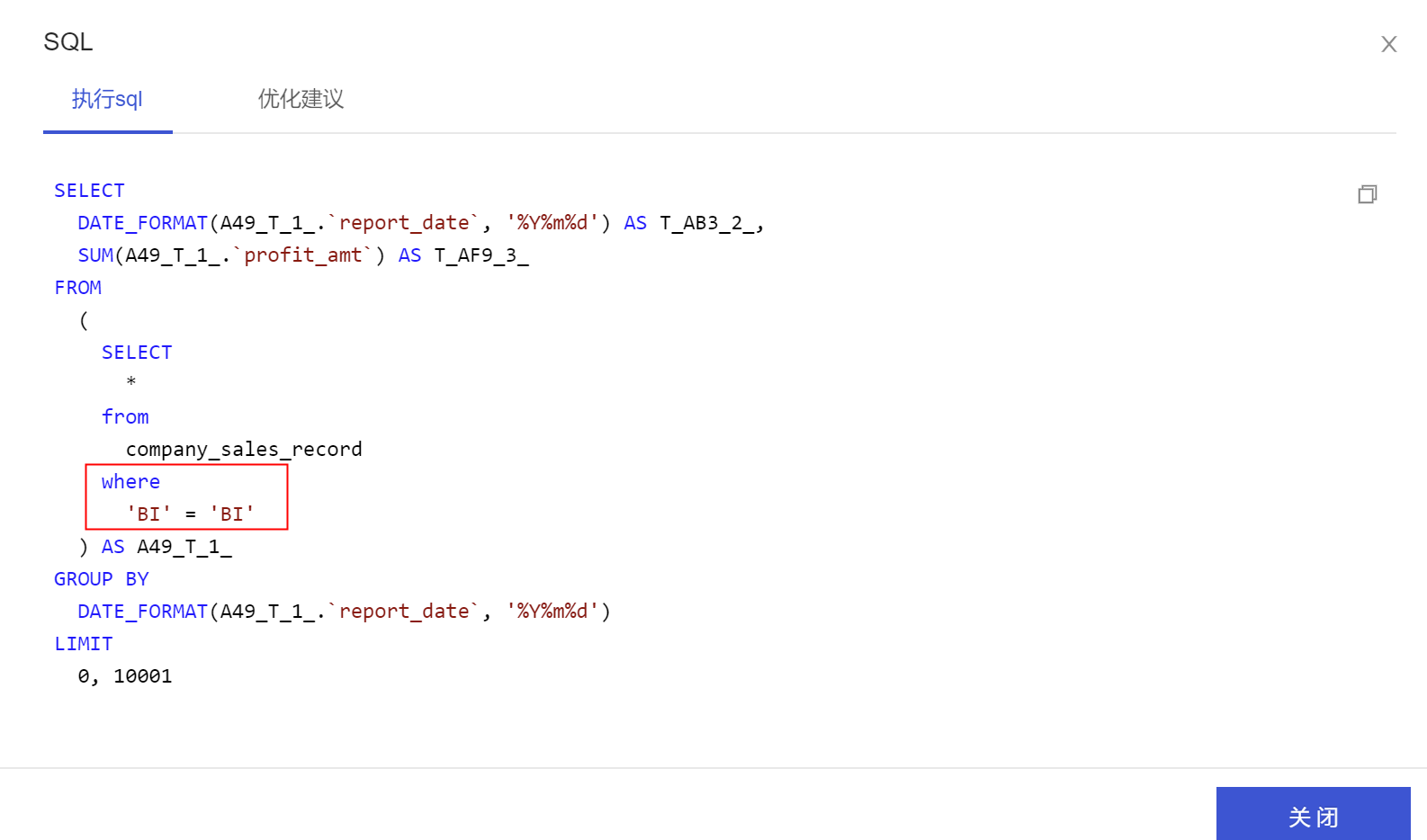 Quick BI复制的交叉表查看SQL发现where条件不一样