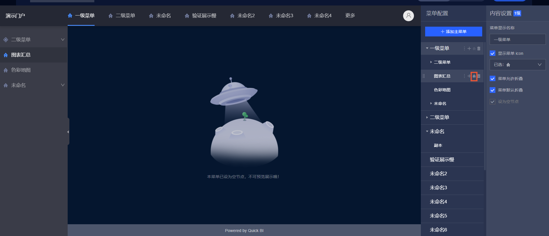 打开数据门户编辑页面,在菜单配置界面,鼠标悬浮在要设置为默认展示的菜单名称上,点击设置主页按钮,点击右上角保存。其他人再预览该数据门户时,打开后展示的首个页面就是该菜单页。