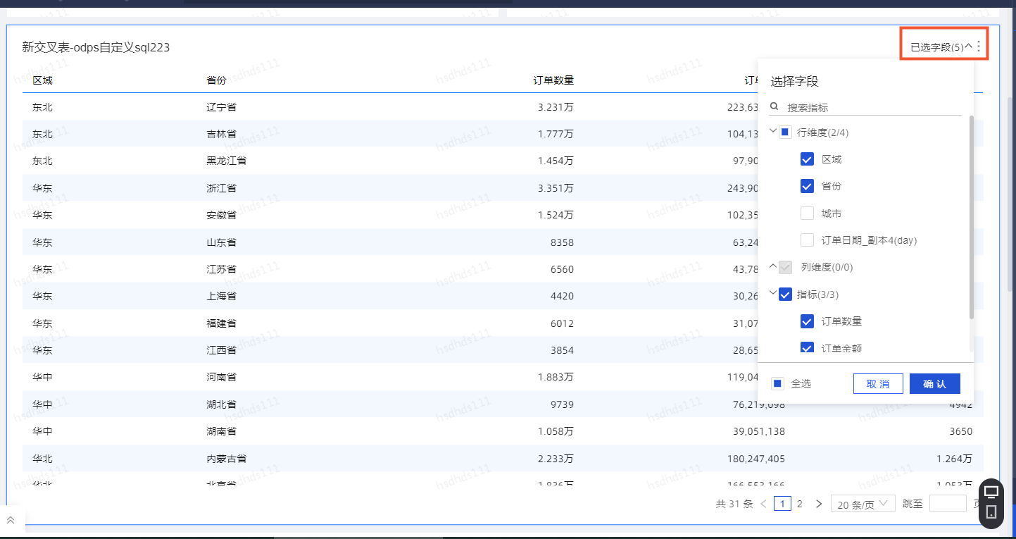 效果如下,可通过右上角的已选字段,勾选需要的维度与度量的组合