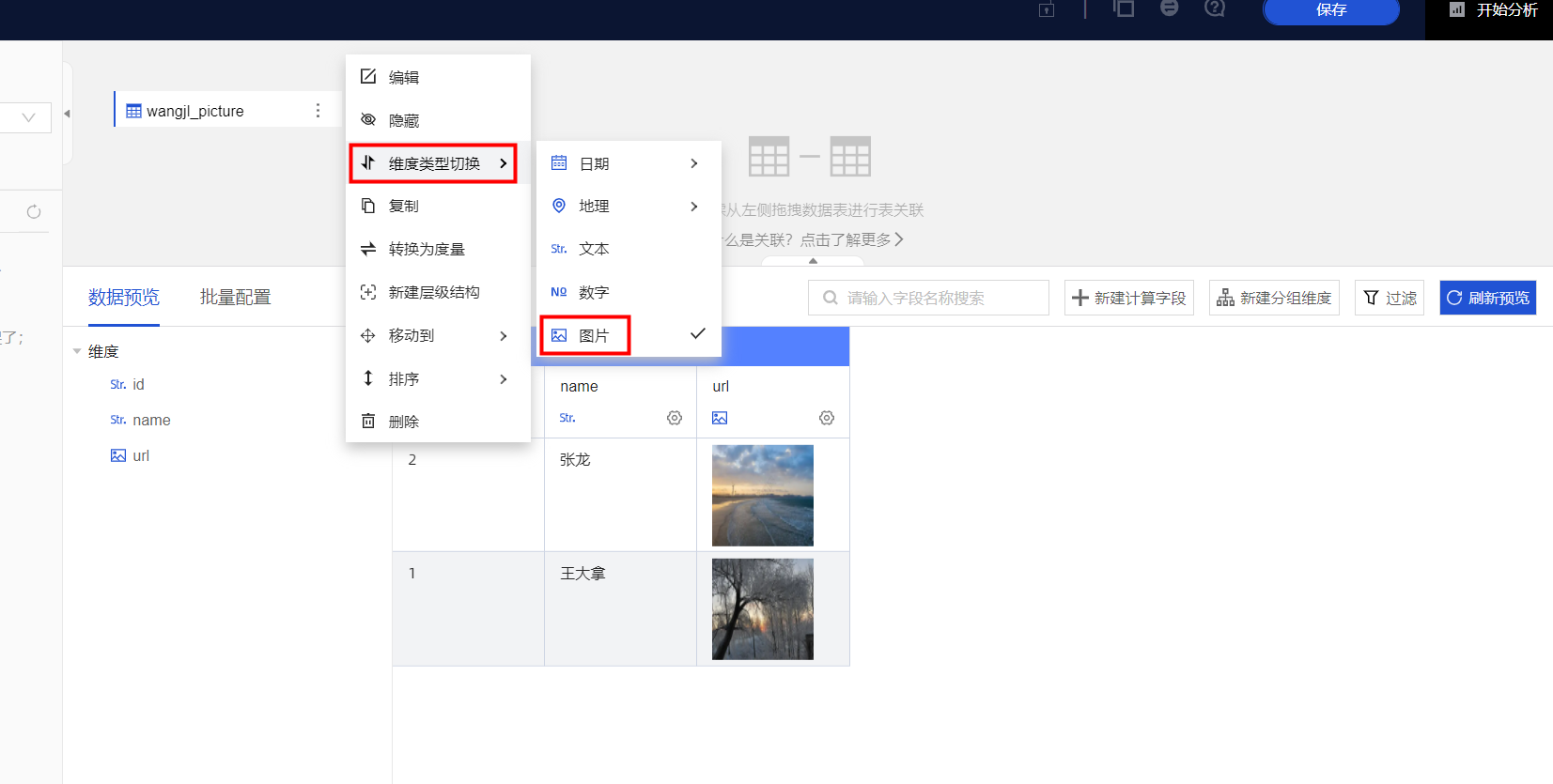 然后用这个表创建数据集,将URL字段更改数据类型为图片,将显示图片内容。
