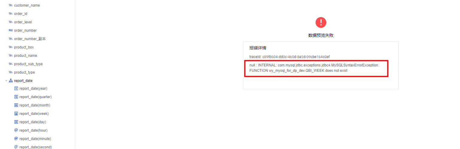 Quick BI数据集保存报错:"FUNCTION wy_mysql_for_dp_dev.QBI_WEEK does not exist"