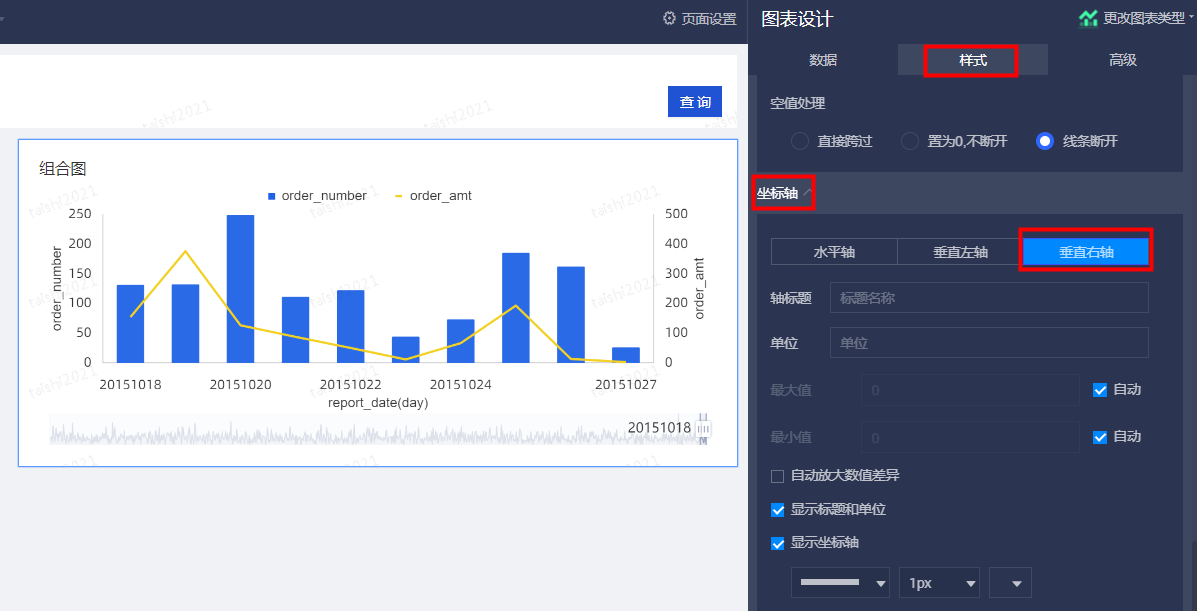 1.进入仪表板编辑页面,选择组合图,完成数据配置,选择样式,找到坐标轴,选择垂直左轴或者垂直右轴。