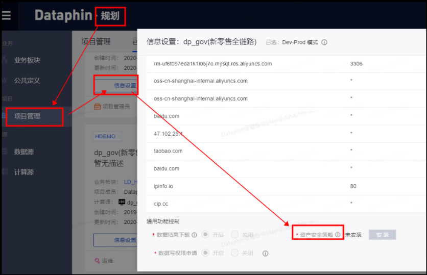在规划>项目管理>信息设置下进行安装资产安全策略。