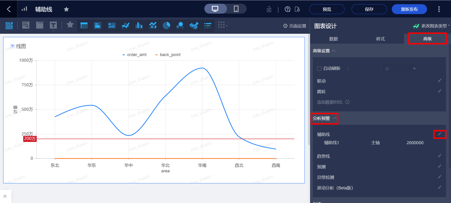 点击图表,在“高级”页签下的“分析预警“菜单中点击辅助线配置。