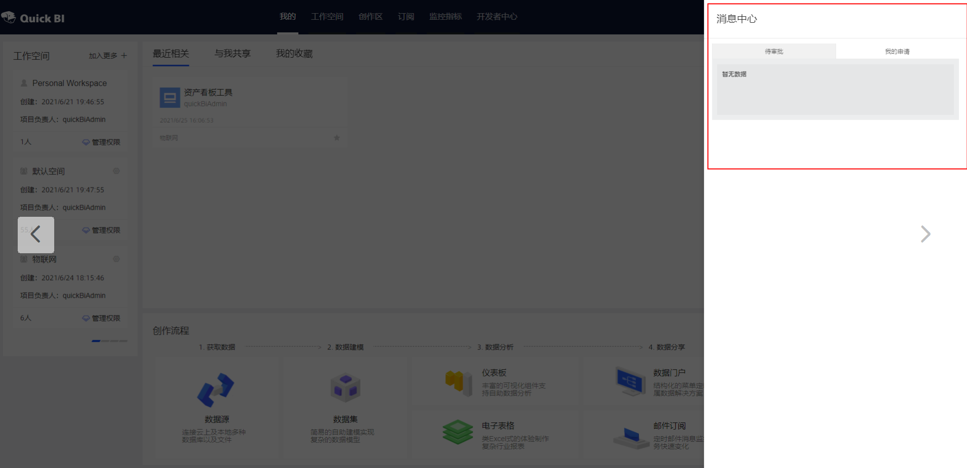 用户在Quick BI中申请了报表查看权限,但是审批人侧一直没有收到对应的审批消息。如下图所示,可以看到申请权限后,在审批人的消息中心没有收到审批消息通知。