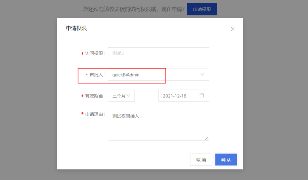 - 发送权限申请时,审批人选择此报表的创建者。