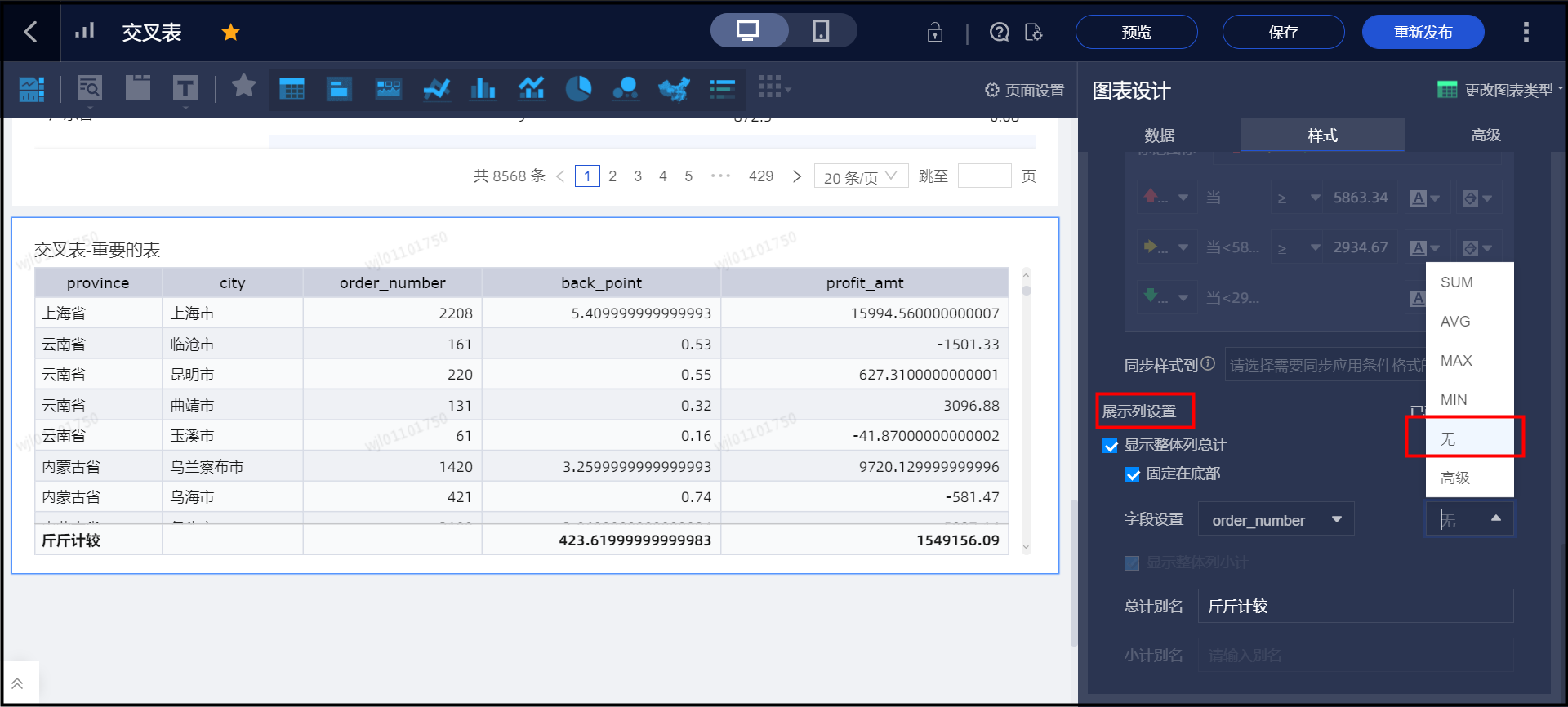 Quick BI如何设置仪表板行列汇总中的某些列不汇总