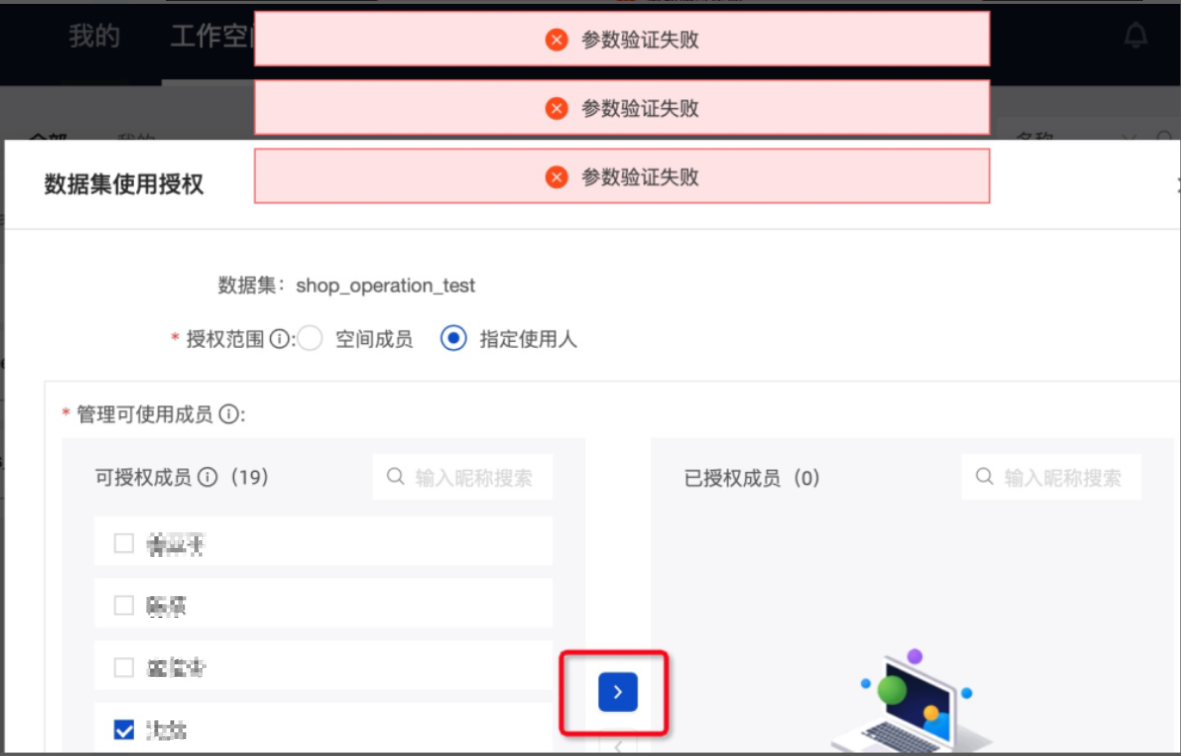 Quick BI在数据集使用授权界面指定使用人提示参数验证失败