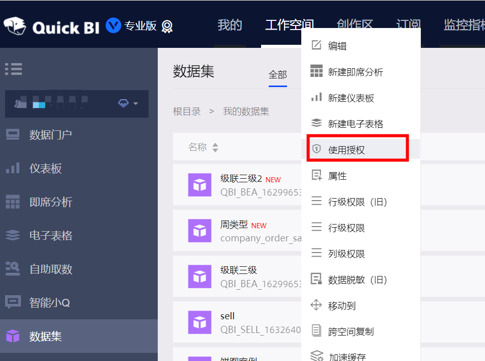 方法一:可以直接在数据集界面,对某个数据集进行使用权限的授权。右键点击某数据集,选择“使用授权”进行设置即可。